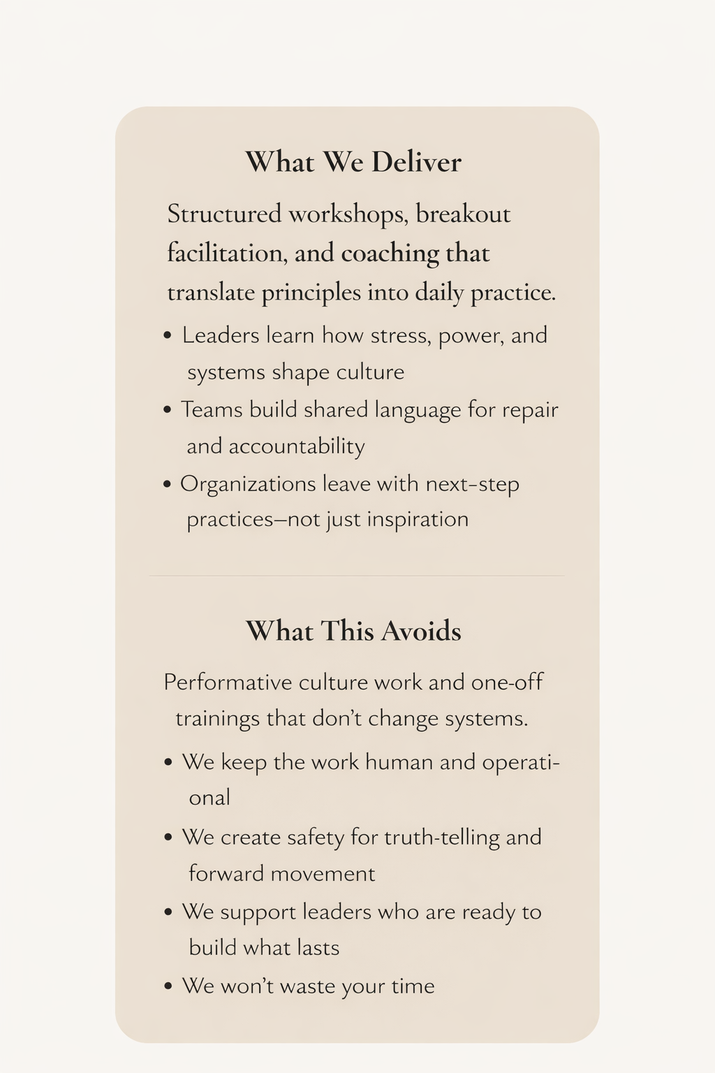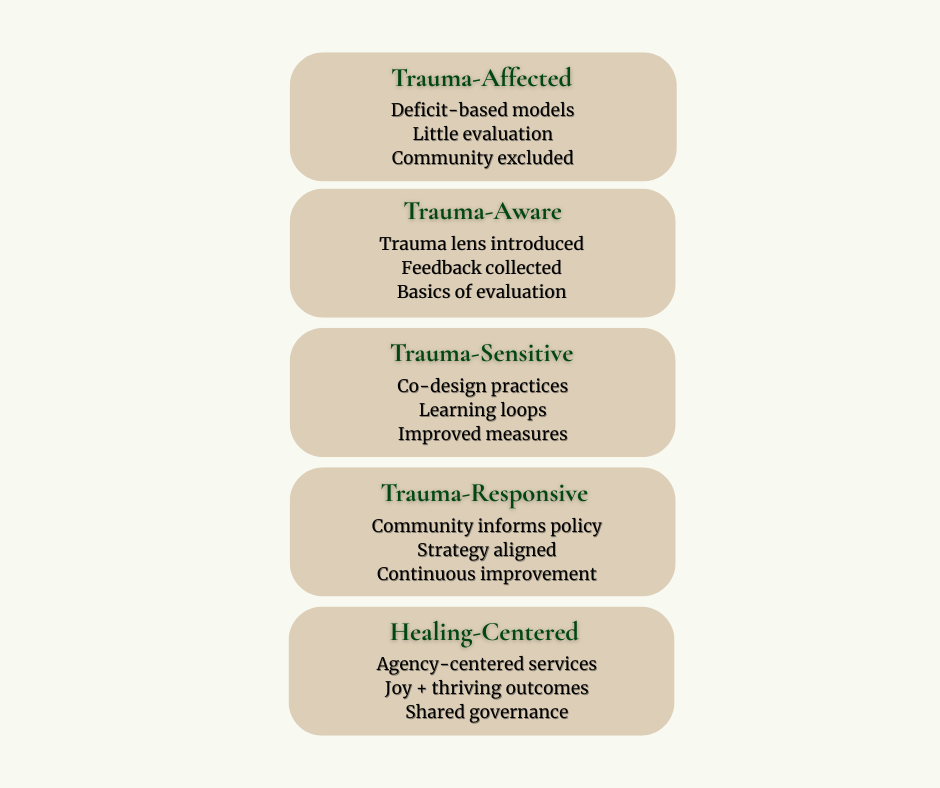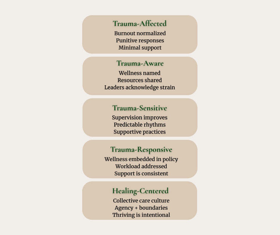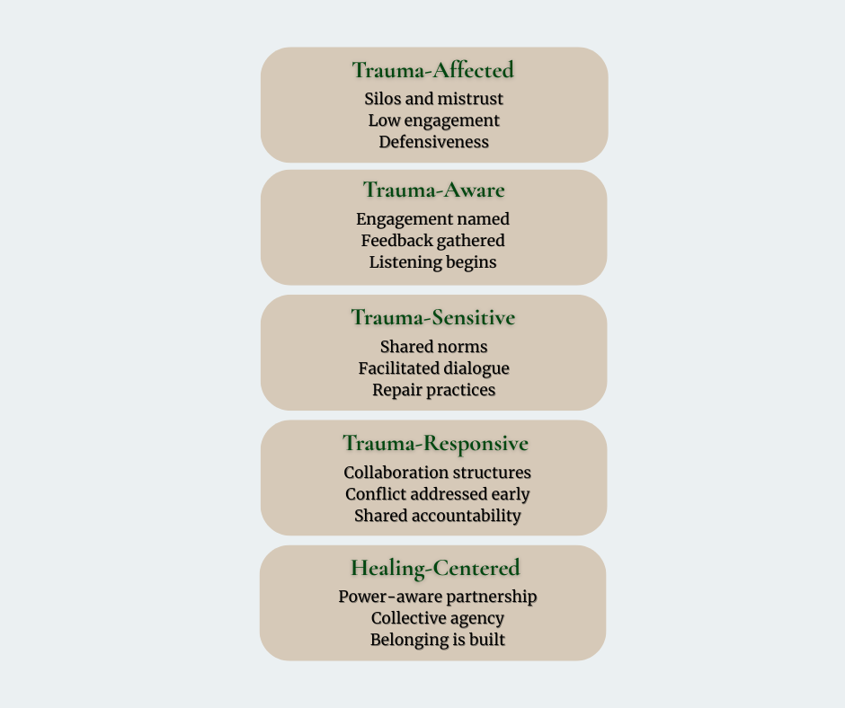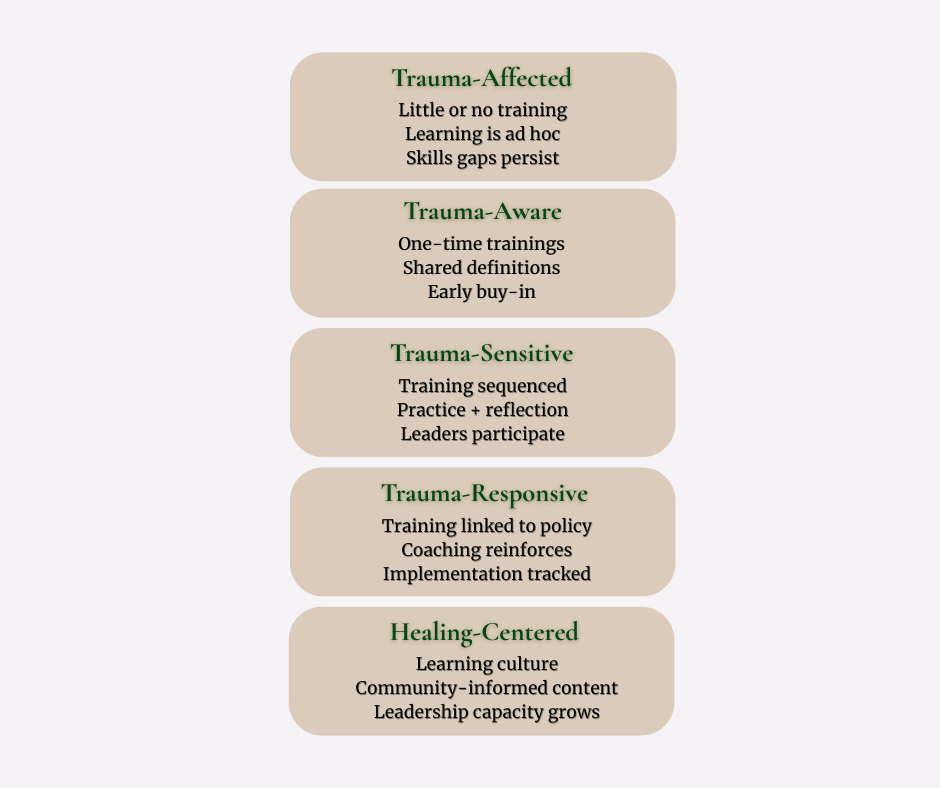 Practical note: most organizations start in “Trauma-Aware” or early “Trauma-Sensitive.” Our work focuses on moving you to the next stage with tools you can sustain.