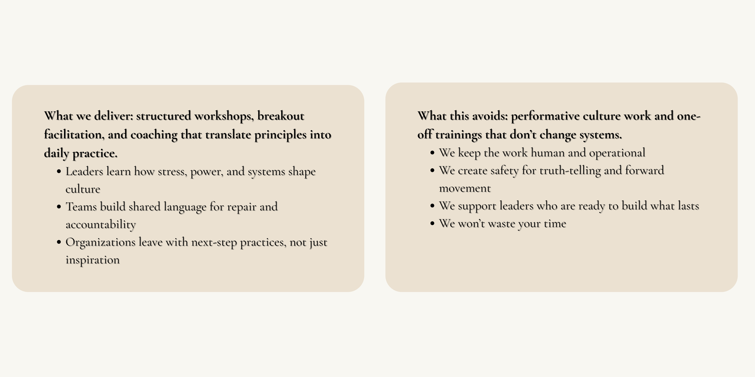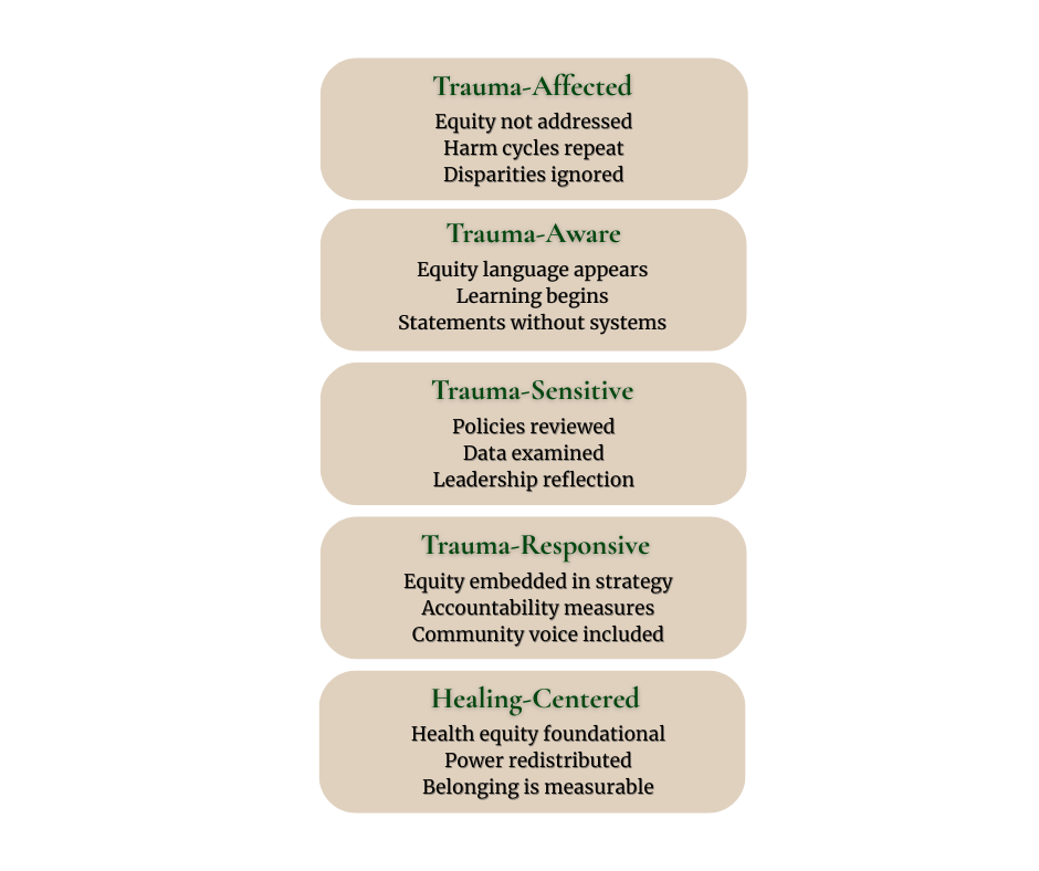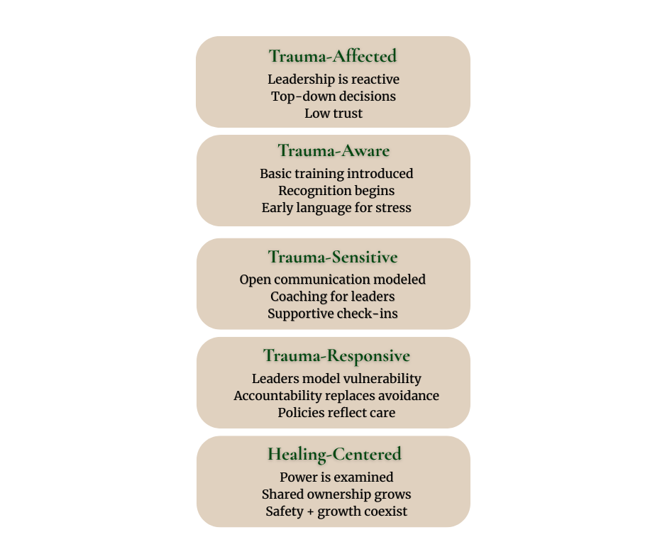We guide leaders from trauma-affected patterns toward a healing-centered culture through structured progression across key domains. This is how healing becomes operational.